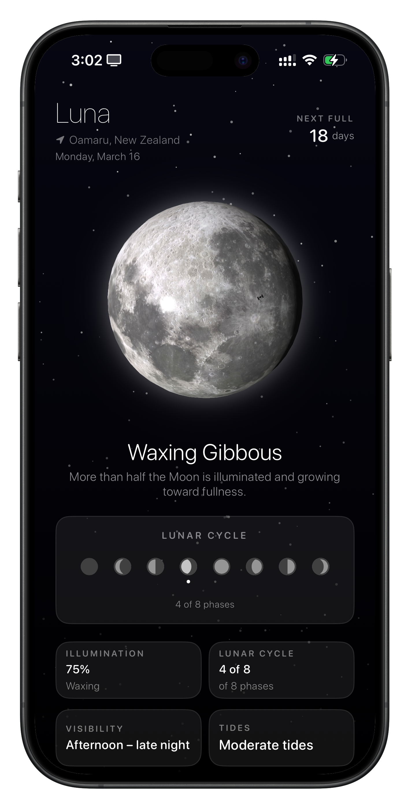 ✅ Full moon countdown – Know how many days are left at a glance.