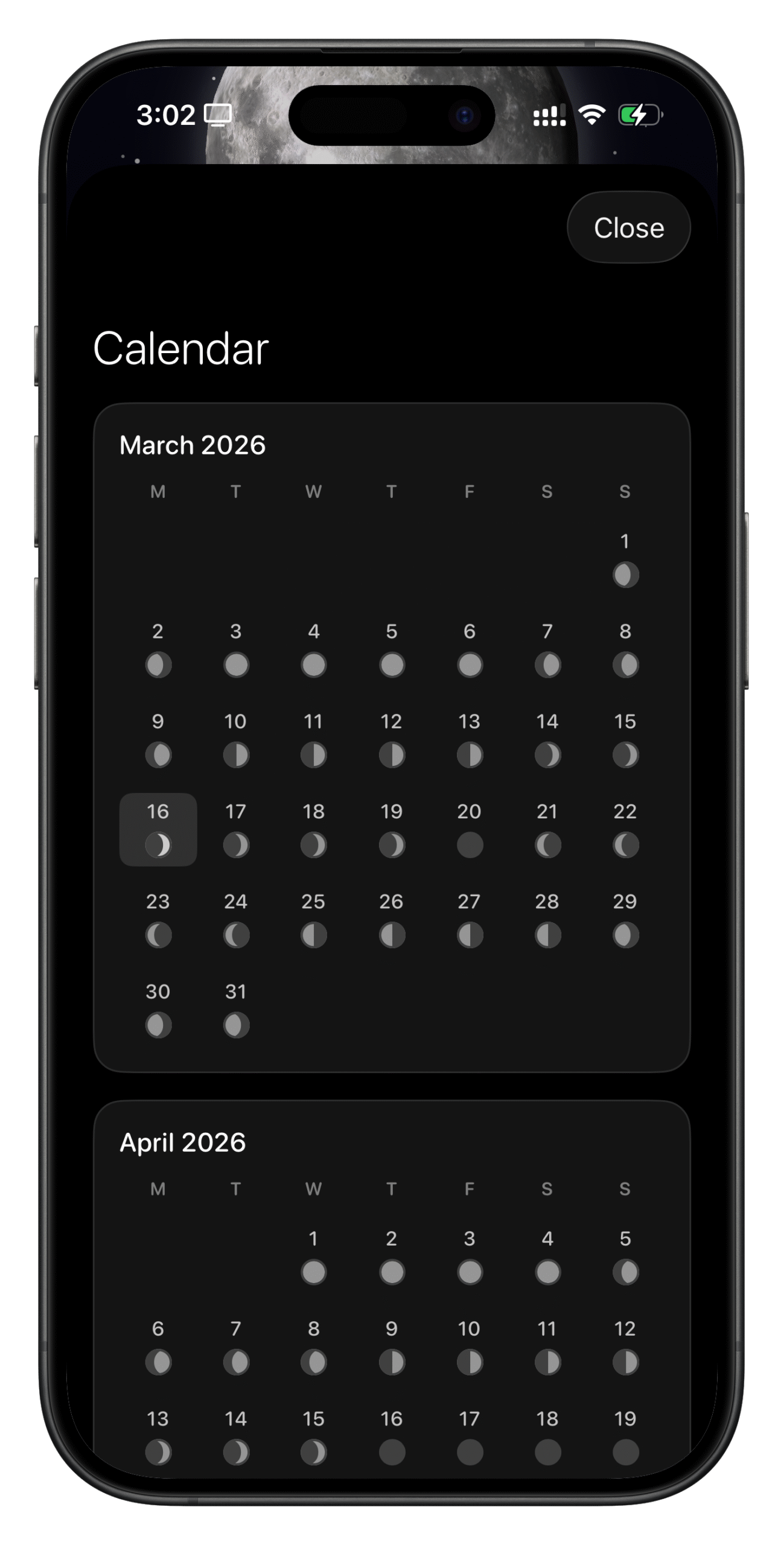 ✅ Beautiful phase calendar – Browse past and upcoming lunar phases.